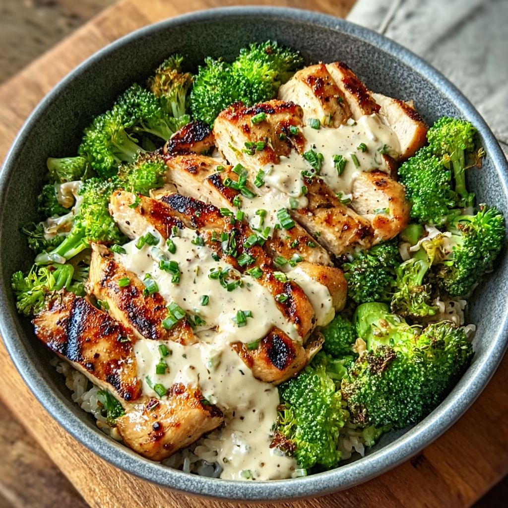 Grilled Chicken & Broccoli Bowls with Creamy Garlic Sauce