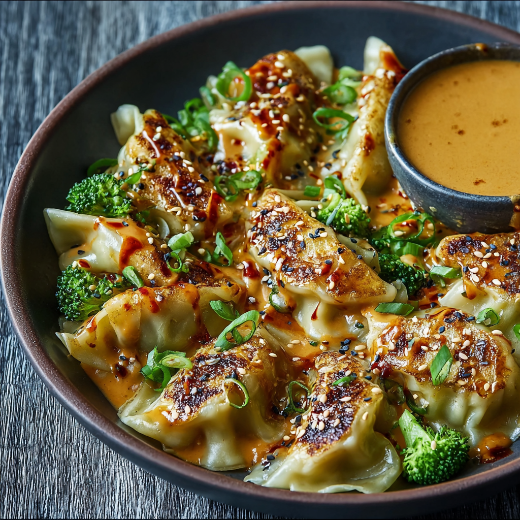 Easy Oven-Baked Dumplings with Creamy Peanut Sauce